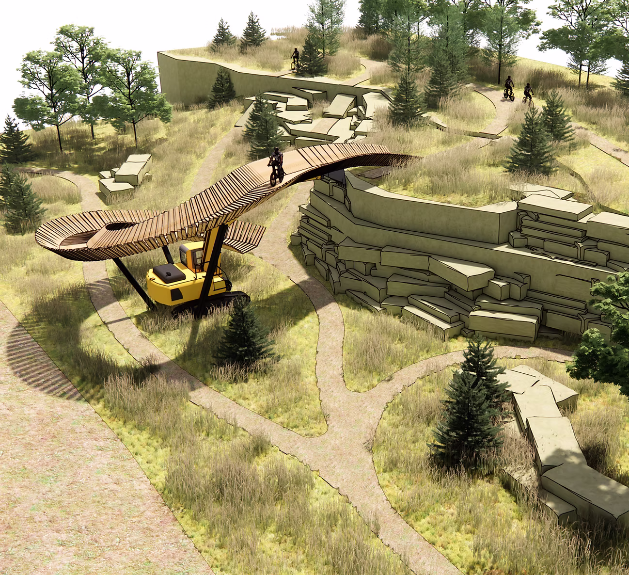 A retired excavator will be set as an elevated rollover that loops from the arm to a lower bench. Historic stiff-leg quarry cranes are being eyed to support a short bridge section. Even the short demo trail, about a thousand feet built this spring, shows what’s possible, with limestone features and flowing lines that preview the look and feel of the full system.